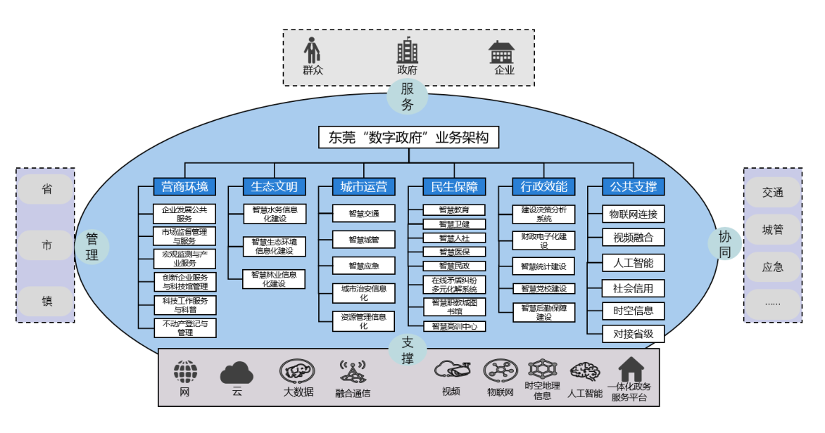 東莞市“數字政府”建設突破傳統(tǒng)業(yè)務條線垂直運作、單部門內循環(huán)模式,以管理、服務、協同和支撐為職能線,以營商環(huán)境、生態(tài)文明、城市運營、民生保障、行政效能和公共支撐為業(yè)務線,構建縱橫貫通的整體型“數字政府”業(yè)務體系。業(yè)務架構圖如下所示: