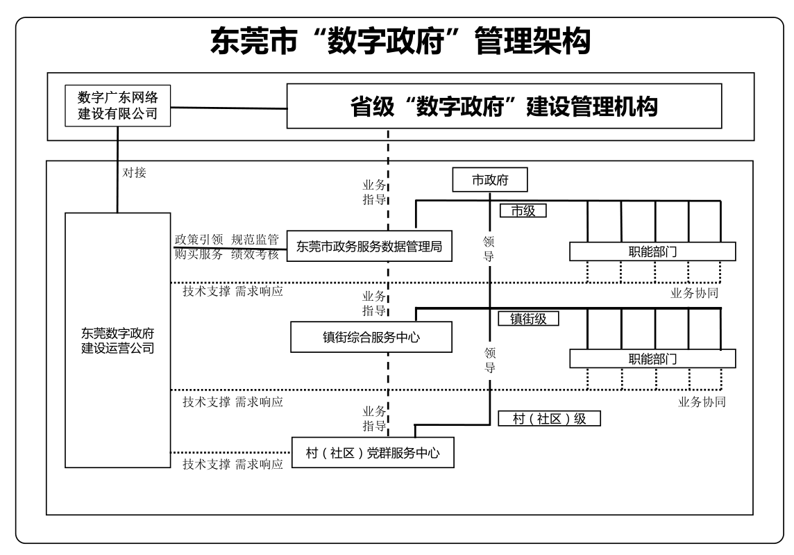 按照“管運分離”的總體原則,在管理機制、運行機制、建設運維模式等方面進行探索創(chuàng)新,在全省“數字政府”改革建設組織管理體系框架下,構建“統(tǒng)一領導、上下銜接、運作高效、統(tǒng)籌有力、整體推進”的東莞市“數字政府”管理體系。