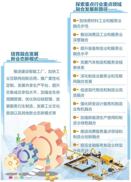 例如:在推動消費品工業和服務業深度融合方面,注重差異化、品質化、綠色化消費需求,推動消費品工業服務化升級;在提升裝備制造業和服務業融合水平方面,推動裝備制造企業向系統集成和整體解決方案提供商轉型;在完善汽車制造和服務全鏈條體系方面,加快汽車由傳統出行工具向智能移動空間升級……