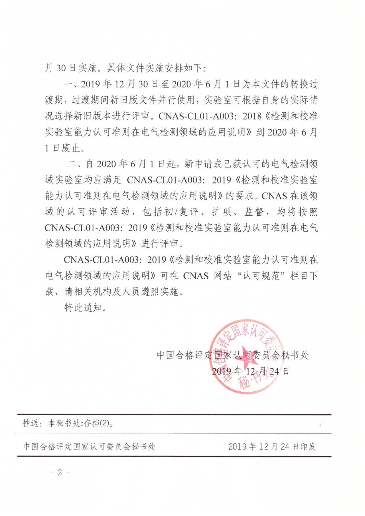關于發布CNAS-CL01-A003:2019《檢測和校準實驗室能力認可準則在電氣檢測領域的應用說明》及其實施安排的通知