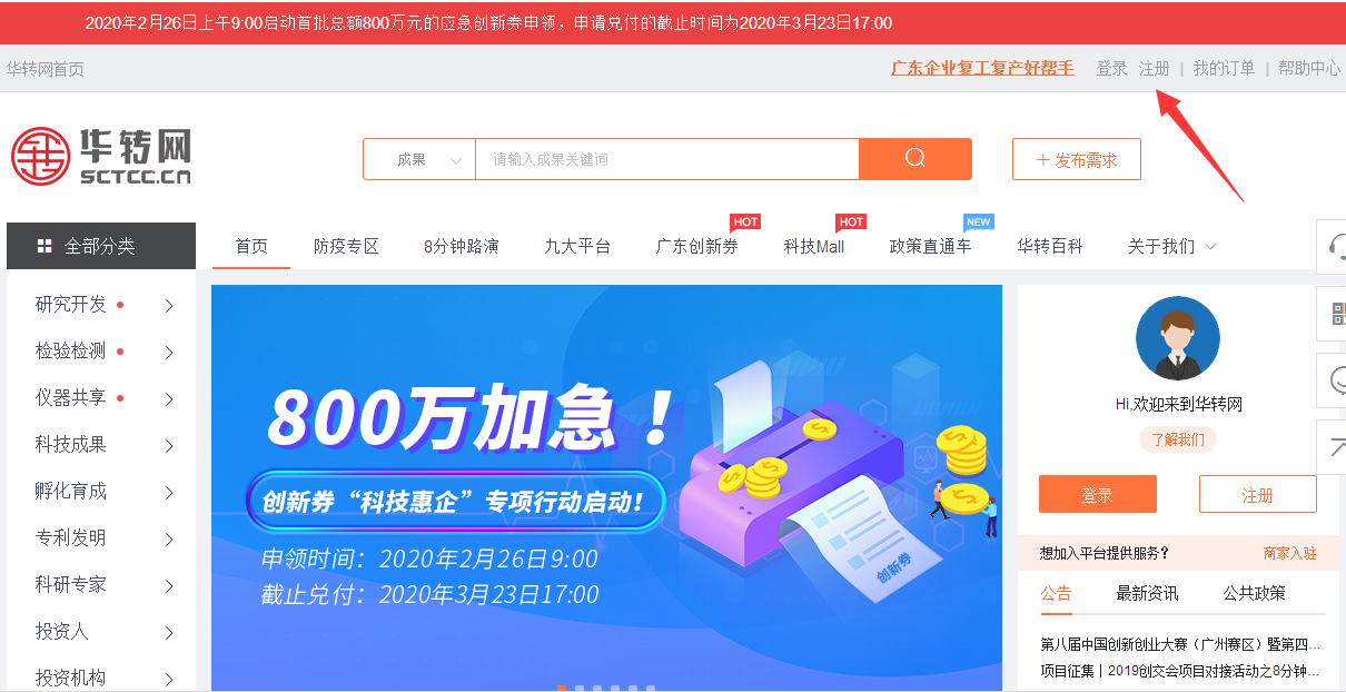 打開廣東省創(chuàng)新券工作實(shí)施的官方平臺——華轉(zhuǎn)網(wǎng)(http://www.sctcc.cn),并完成注冊步驟。