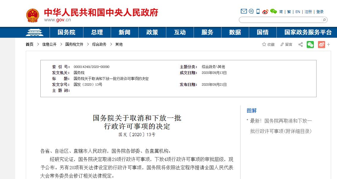 經(jīng)研究論證,國(guó)務(wù)院決定取消29項(xiàng)行政許可事項(xiàng),下放4項(xiàng)行政許可事項(xiàng)的審批層級(jí),現(xiàn)予公布。另有20項(xiàng)有關(guān)法律設(shè)定的行政許可事項(xiàng),國(guó)務(wù)院將依照法定程序提請(qǐng)全國(guó)人民代表大會(huì)常務(wù)委員會(huì)修訂相關(guān)法律規(guī)定。